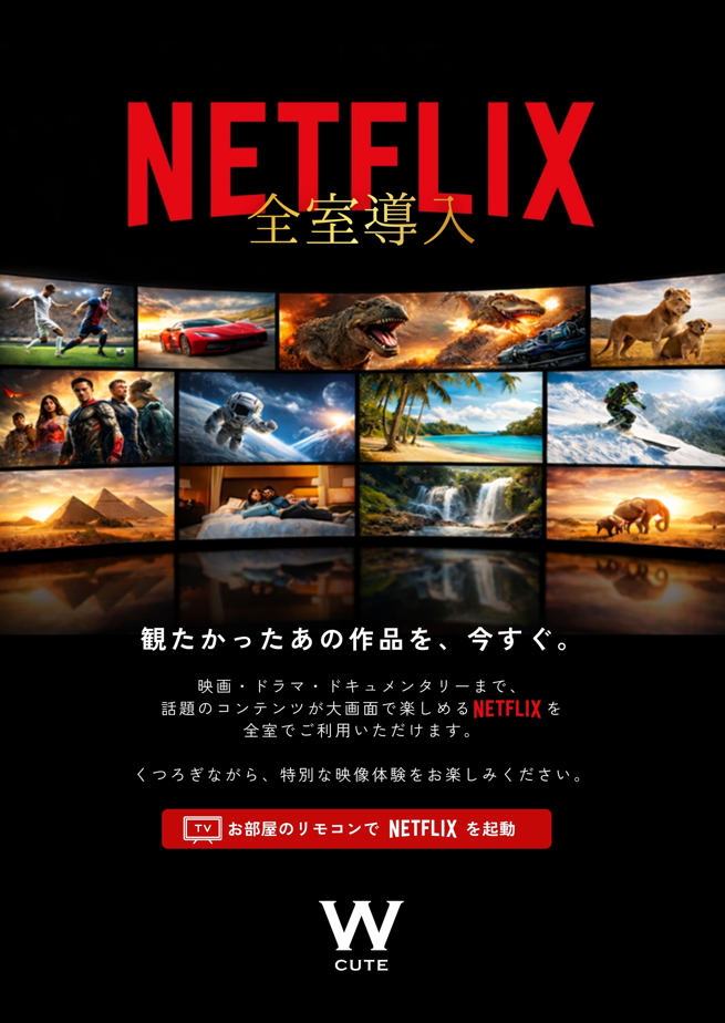 65インチ4Kテレビを一挙20台大量導入! ロイヤルVIPルーム、VIPルーム、エグゼクティブルーム全室で大画面でネットフリックス、ユーチューブがお楽しみいただけます。